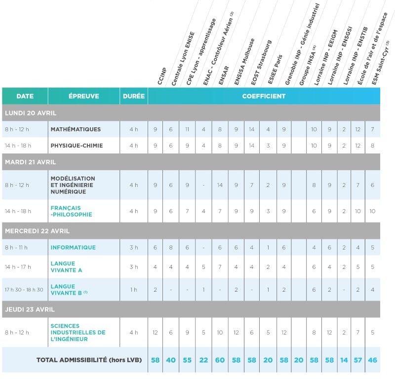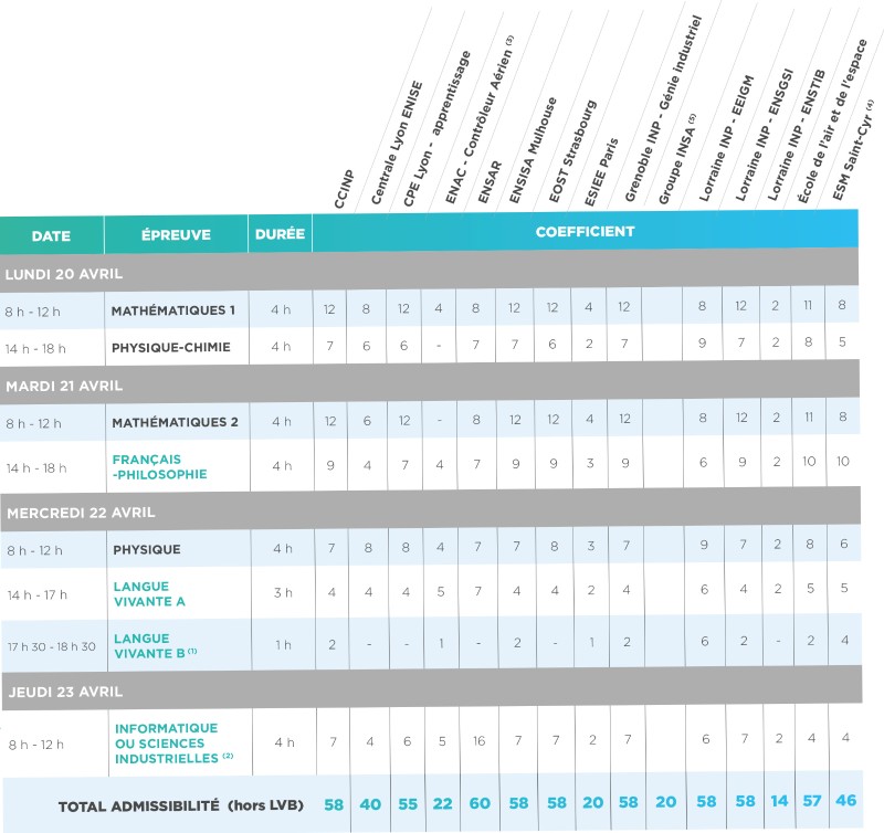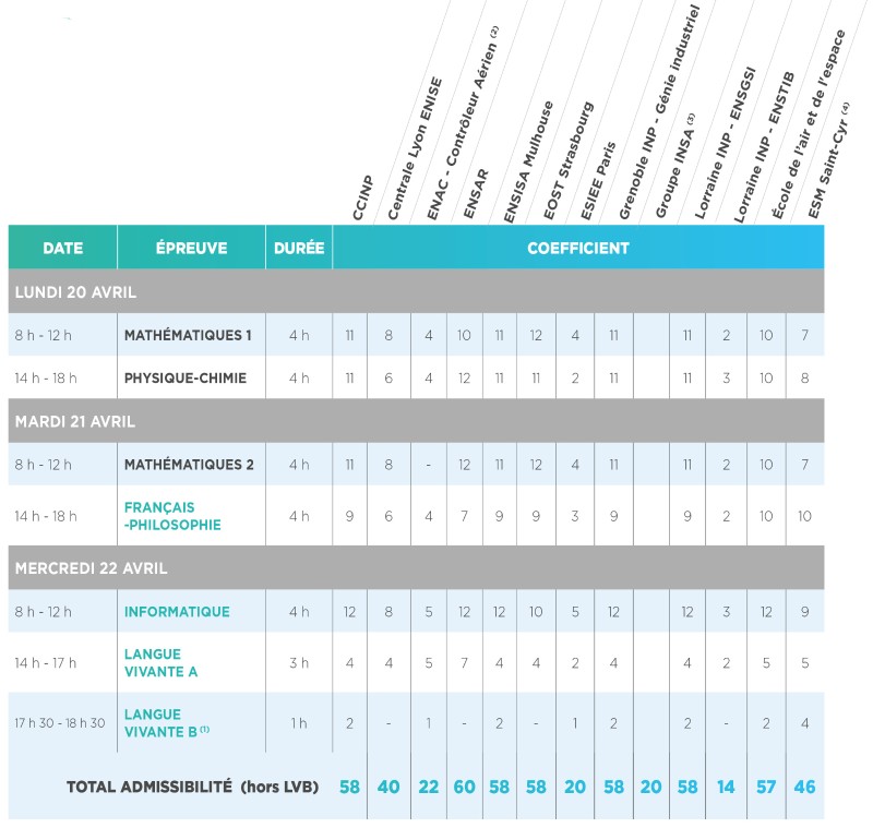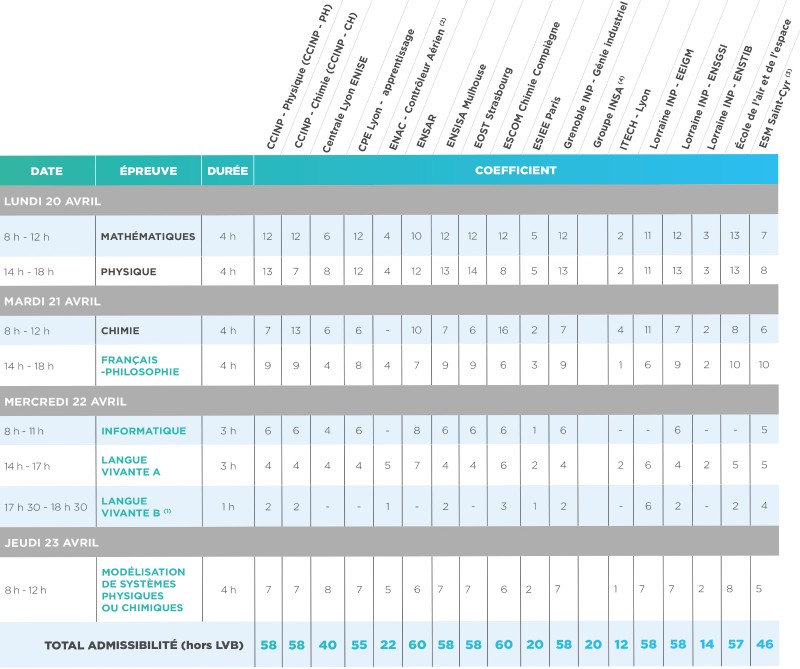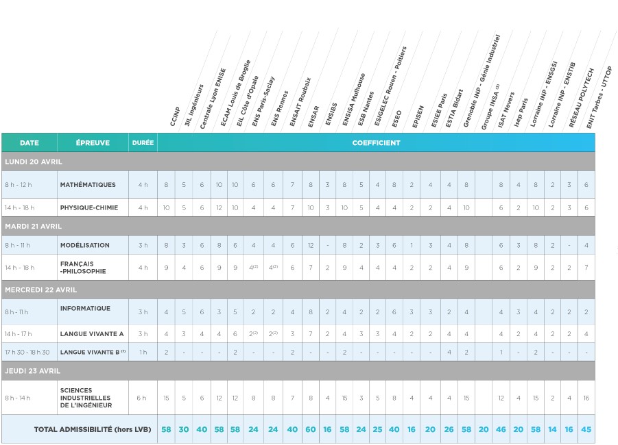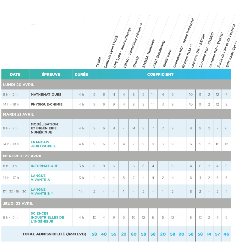 (1) Épreuve facultative : seuls les points au-dessus de 10/20 sont pris en compte excepté pour l'École Lorraine INP - EEIGM où l’épreuve est obligatoire et où les points sont pris en compte quelle que soit la note obtenue.