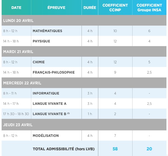 Les épreuves de Français-Philosophie, Langue vivante A, Langue vivante B, Informatique, Modélisation de systèmes physiques ou chimiques sont des épreuves CCINP mutualisées avec la banque e3a - Polytech.