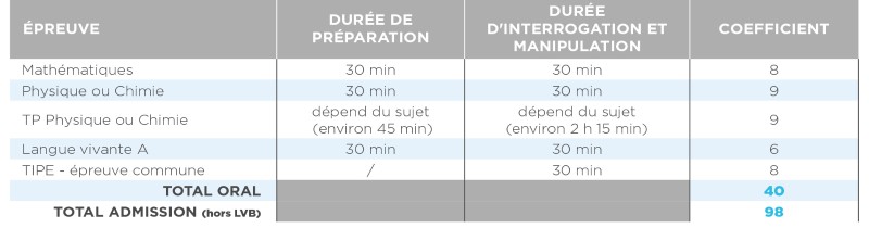 Épreuves de Physique ou Chimie et de TP Physique ou TP Chimie : ces épreuves sont tirées au sort. Si l’interrogation orale s’appuie sur la Physique, le TP porte sur la Chimie et inversement, même pour les candidats inscrits à un seul concours (PC-Physique ou PC-Chimie). Pour les TP de Chimie, le candidat devra obligatoirement apporter sa paire de lunettes de protection et sa blouse qu'il portera pendant les manipulations. Il est interdit aux candidats de sortir pendant la première demi-heure de l’épreuve.